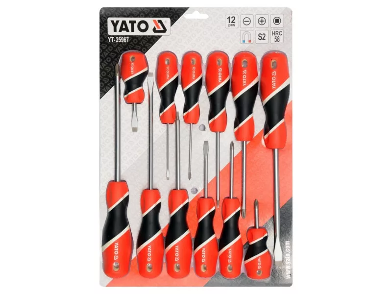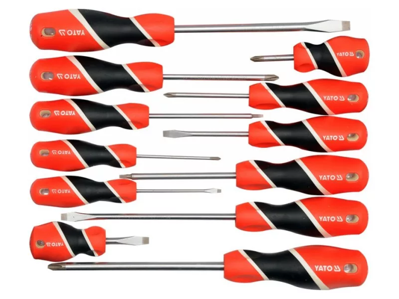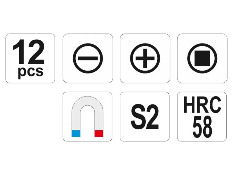 Tizenkét professzionális csavarhúzó készlet S2 acélból készült, kb. 58 HRC-re edzett szárral.
