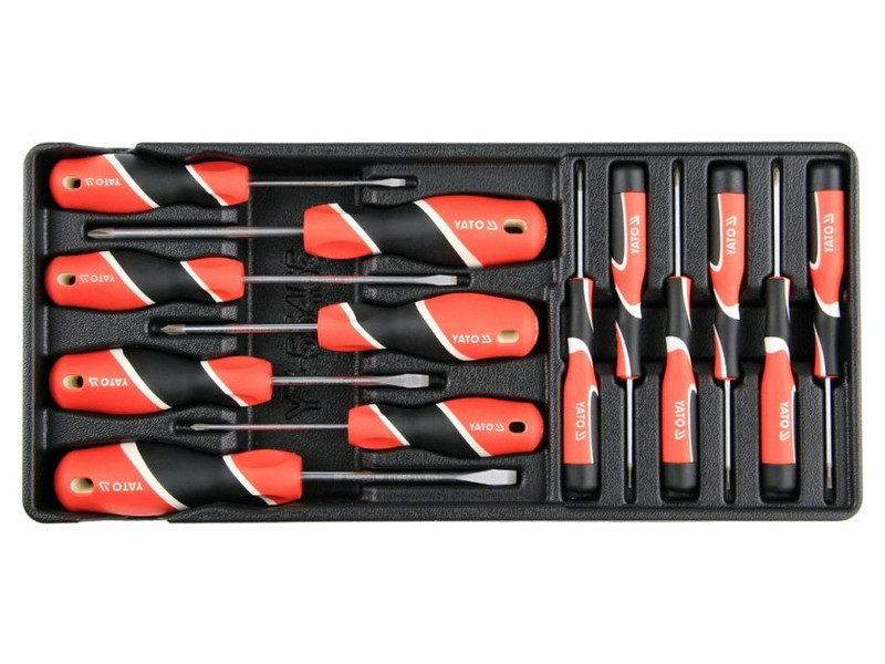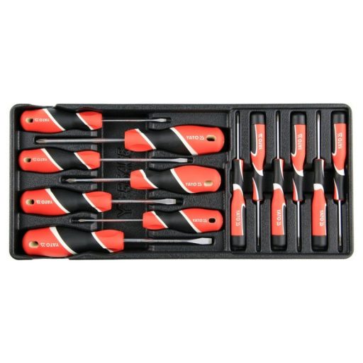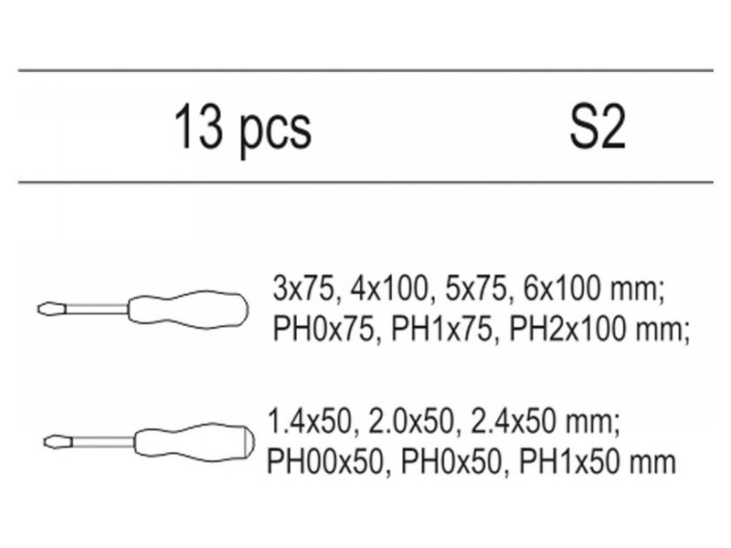 13 csavarhúzóból álló készletet tartalmazó fiókbetét - betét - csavarhúzók 3x75, 5x75, 4x100, 6x100 - csavarhúzók PH0x75, PH1x75, PH2x100 mm - csavarhúzók 1.4x50, 2.0x50, 2.4x50 - csavarhúzók PH00x50, PH0x50, PH1x50 mm.