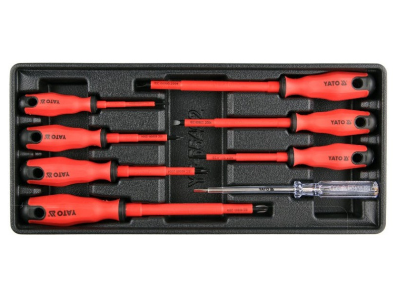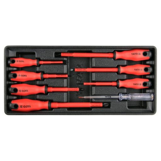 Szigetelt csavarhúzókat tartalmazó fiókbetét - Szigetelt csavarhúzók 3x75, 4x100, 5.5x125, 6.5x150 1000V - Szigetelt csavarhúzók PH1x80, PH2x100, PH3x150mm 1000V - Elektromos tesztelő 4x190mm 250V