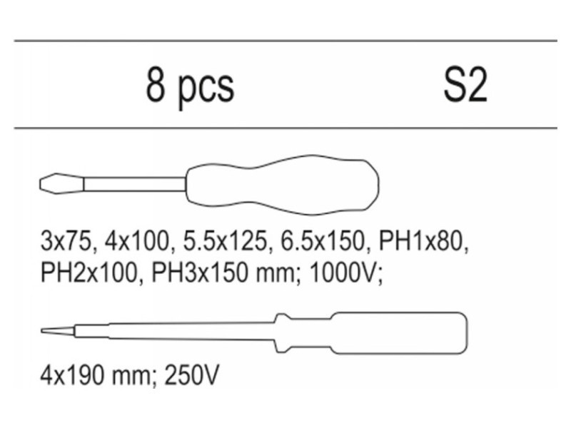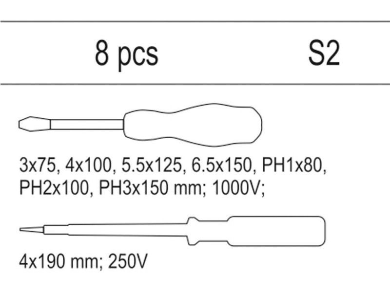 | Állítsa be a tartalmat | szigetelt csavarhúzó x7 (lapos: 2,5x75 mm, 4x100 mm, 5,5x125 mm, 6,5x150 mm; Phillips (PH): PH1x80 mm, PH2x100 mm, PH3x150 mm), feszültségmérő (4x190 mm, 250V) |