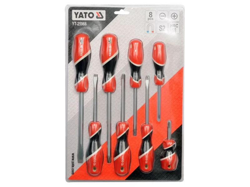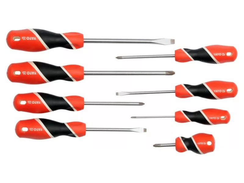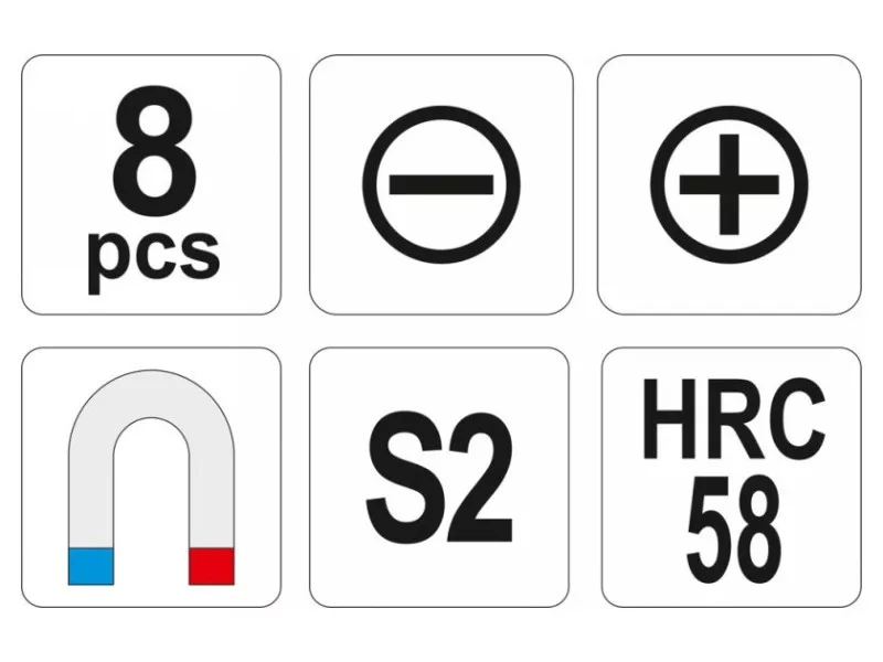 Nyolc professzionális csavarhúzó készlet S2 acélból készült, kb. 58 HRC-re edzett szárral.