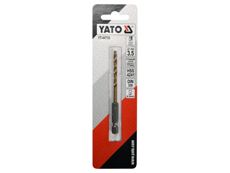 Titánbevonatú fém fúrószár hatszögletű szárral a YATO YT-44756-tól, nagy sebességű HSS acélból, titánbevonatú. Hasított hegye lehetővé teszi a fúrást előzetes bevágás nélkül.