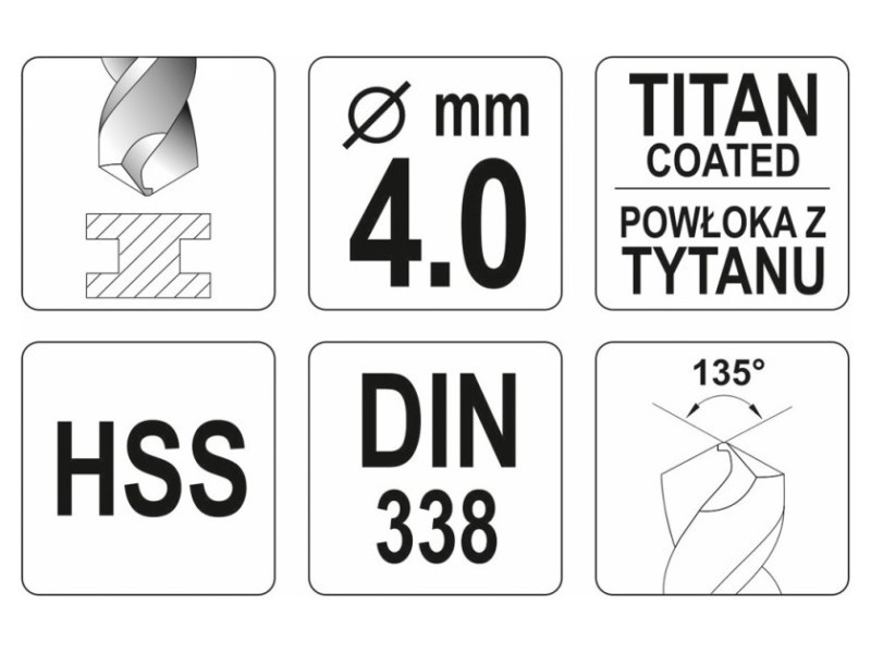 Csiszolt fúrófej agresszív vágóél-geometriával. Titán-nitrid bevonatának köszönhetően nagyon hatékonyan vezeti el a hőt, és nem tompul kemény acélok megmunkálásakor. A penge 135°-os dőlésszöge lehetővé teszi a fúrást hegy előzetes használata nélkül is. A DIN 338 szabvány szerint gyártott, ipari professzionális használatra.