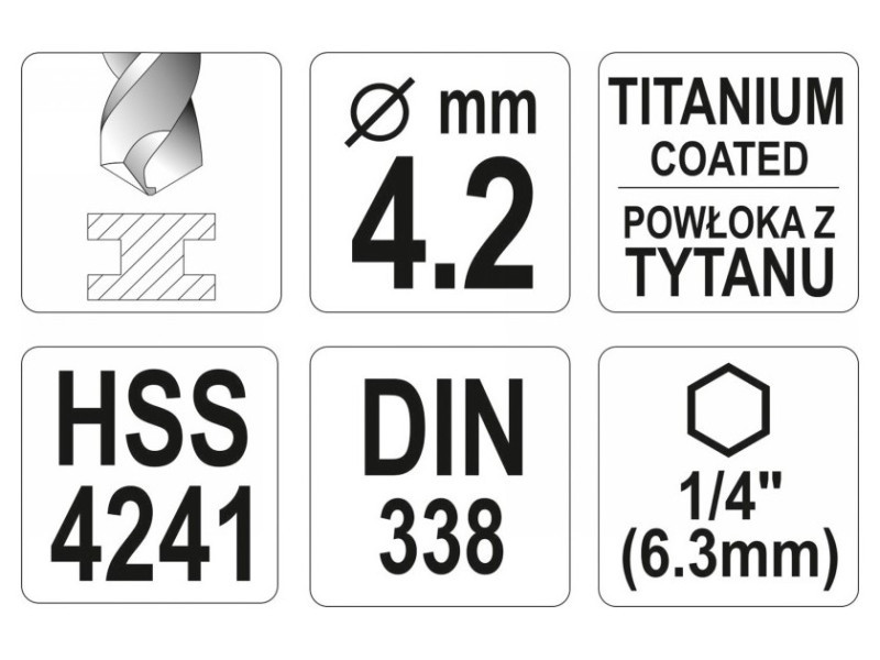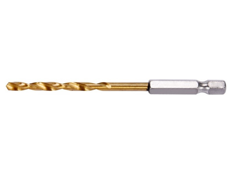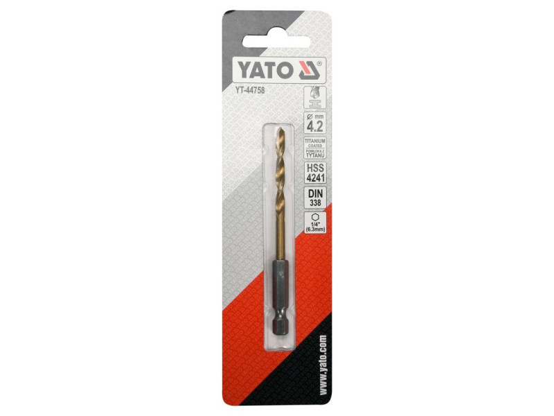 Titánbevonatú fém fúrószár hatszögletű szárral a YATO YT-44758-tól, nagy sebességű HSS acélból, titánbevonatú.