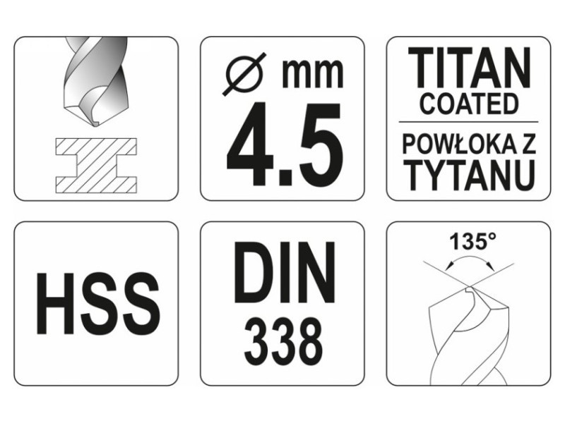 Csiszolt fúrófej agresszív vágóél-geometriával. Titán-nitrid bevonatának köszönhetően nagyon hatékonyan vezeti el a hőt, és nem tompul kemény acélok megmunkálásakor. A penge 135°-os dőlésszöge lehetővé teszi a fúrást hegy előzetes használata nélkül is. A DIN 338 szabvány szerint gyártott, ipari professzionális használatra.