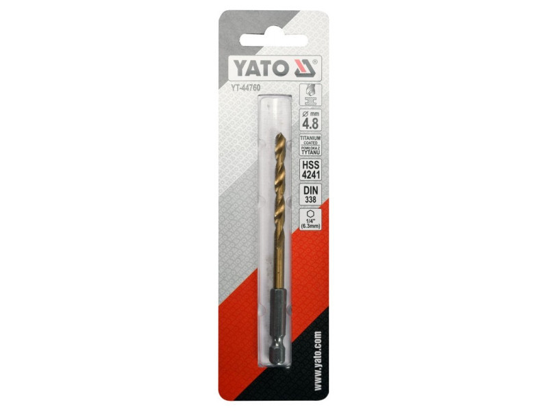 Titánbevonatú fém fúrószár hatszögletű szárral a YATO YT-44760 által, nagy sebességű HSS acélból, titánbevonatú.