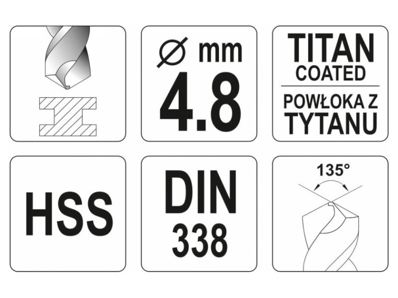 Csiszolt fúrófej agresszív vágóél-geometriával. Titán-nitrid bevonatának köszönhetően nagyon hatékonyan vezeti el a hőt, és nem tompul kemény acélok megmunkálásakor. A penge 135°-os dőlésszöge lehetővé teszi a fúrást hegy előzetes használata nélkül is. DIN 338 szabvány szerint gyártva, professzionális ipari felhasználásra.