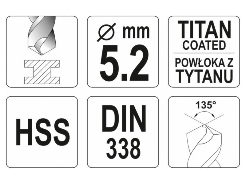 Csiszolt fúrófej agresszív vágóél-geometriával. Titán-nitrid bevonatának köszönhetően nagyon hatékonyan vezeti el a hőt, és nem tompul kemény acélok megmunkálásakor. A penge 135°-os dőlésszöge lehetővé teszi a fúrást hegy előzetes használata nélkül is.