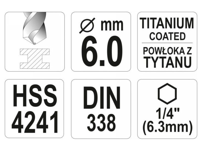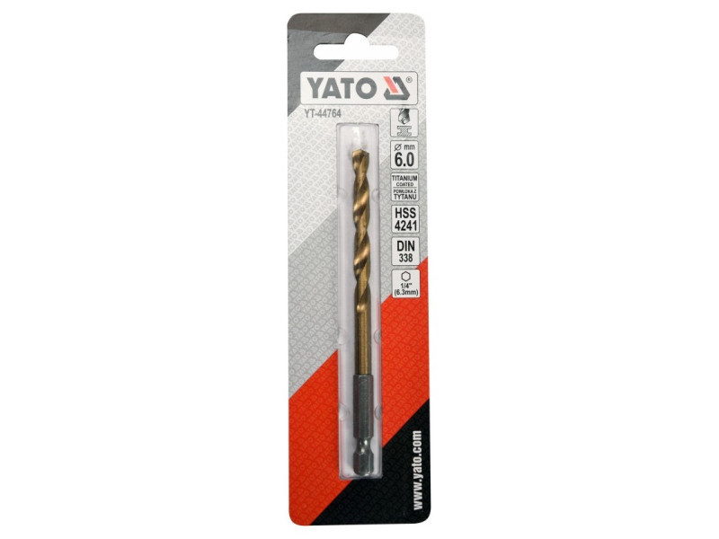 Titánbevonatú fém fúrószár hatszögletű szárral a YATO YT-44764 által, nagy sebességű HSS acélból, titánbevonatú.
