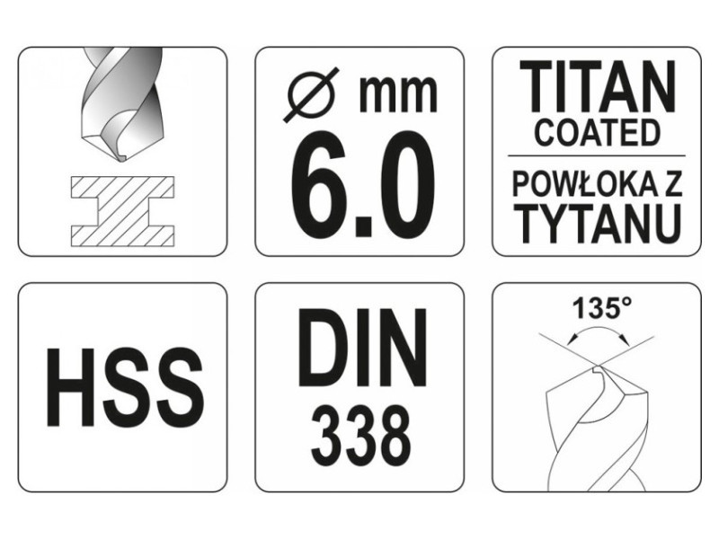 Csiszolt fúrófej agresszív vágóél-geometriával. Titán-nitrid bevonatának köszönhetően nagyon hatékonyan vezeti el a hőt, és nem tompul kemény acélok megmunkálásakor. A penge 135°-os dőlésszöge lehetővé teszi a fúrást hegy előzetes használata nélkül is. A DIN 338 szabvány szerint gyártott, ipari professzionális használatra.