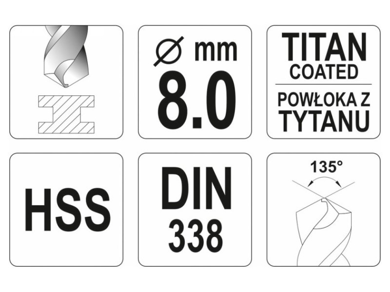 Csiszolt fúrófej agresszív vágóél-geometriával. Titán-nitrid bevonatának köszönhetően nagyon hatékonyan vezeti el a hőt, és nem tompul kemény acélok megmunkálásakor. A penge 135°-os dőlésszöge lehetővé teszi a fúrást hegy előzetes használata nélkül is. A DIN 338 szabvány szerint gyártott, ipari professzionális használatra.