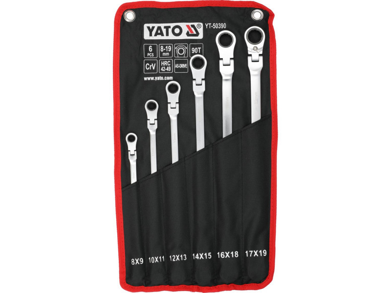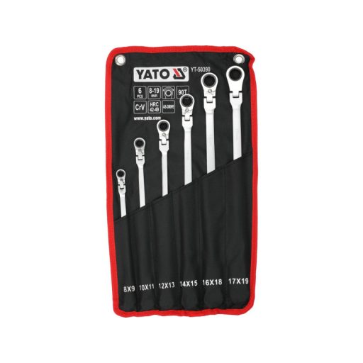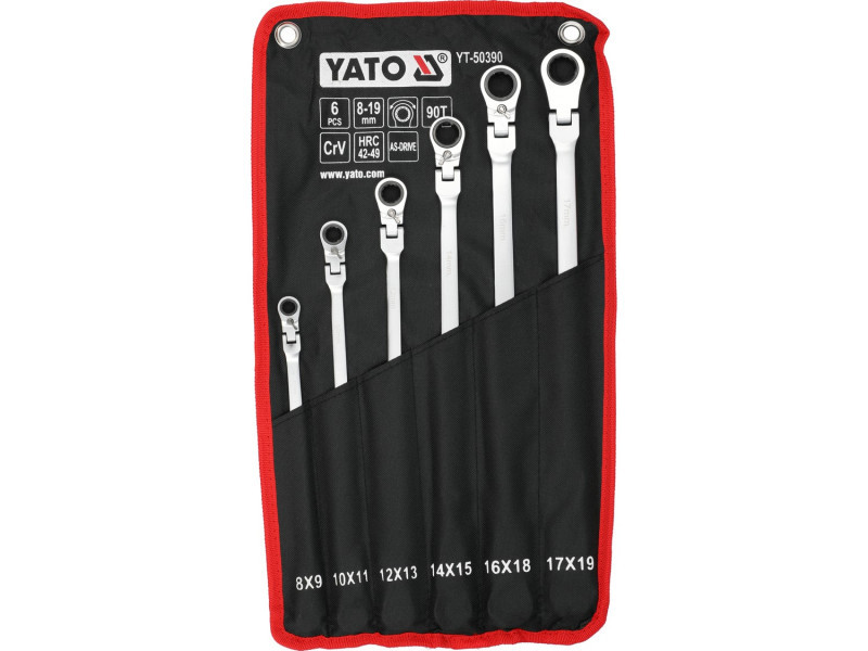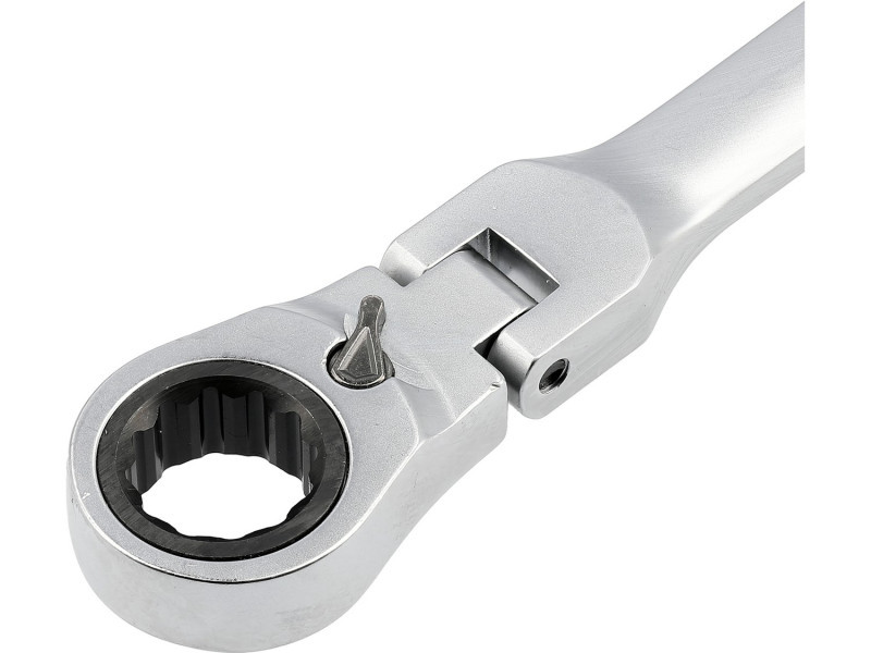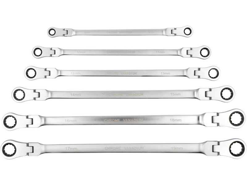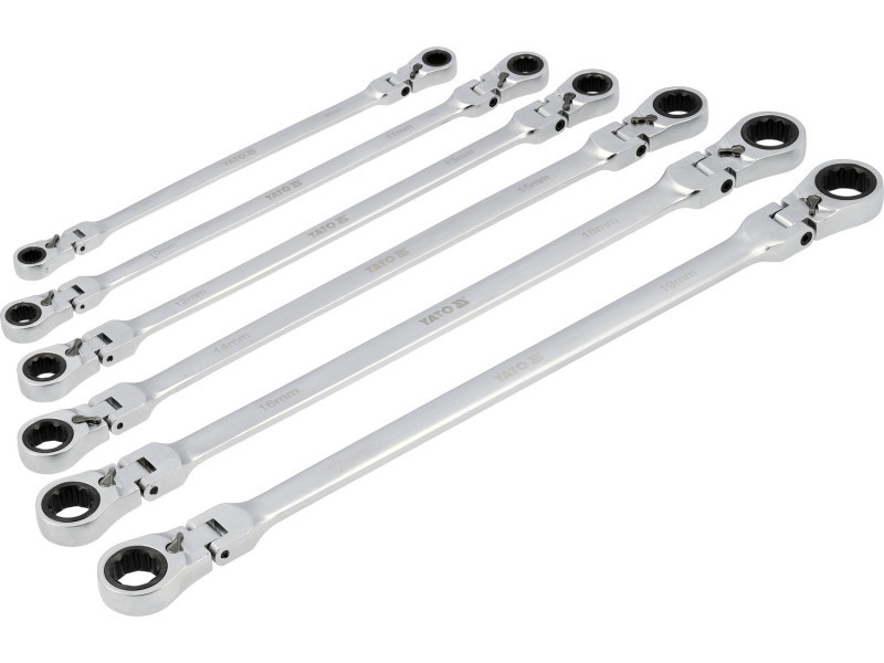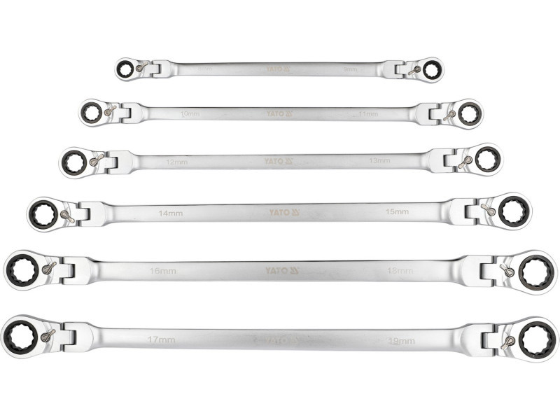 Hosszú villáskulcs készlet racsnis mechanizmussal és ízülettel, amely a csavaros kapcsolatok kezelésére szolgál, amelyek nagy erőt és különböző szögek alatti hozzáférést igényelnek. A meghosszabbított test növeli a kar hosszát, megkönnyítve ezzel a szorosan meghúzott elemek lazítását, míg az ízületes fej lehetővé teszi a kulcs kényelmes pozícióba állítását a csavar vagy anya viszonylatában. A 90 fogas racsnis mechanizmus kis munkaszöget biztosít, és lehetővé teszi a sima meghúzást vagy lazítást anélkül, hogy a kulcsot le kellene venni a kapcsolódó elemről.