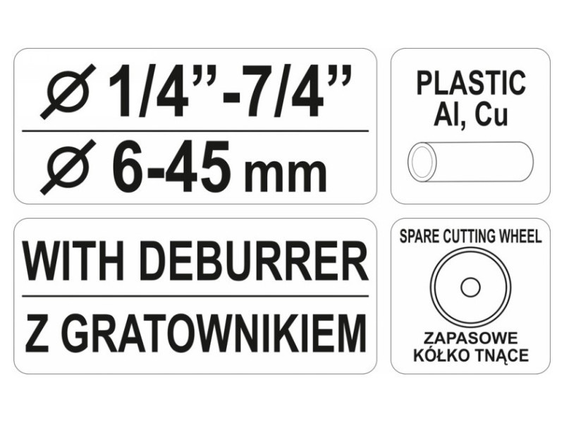 Csővágó 6 ~ 45 mm (1/4"~1-3/4") átmérőjű csövekhez. Réz, alumínium és műanyag csövek vágására tervezték .