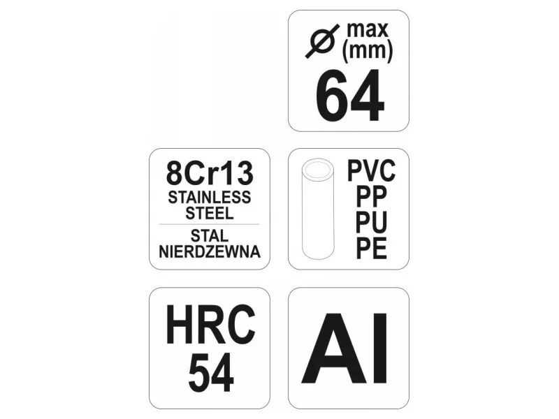 - a 8cr13 rozsdamentes acélból készült, hrc 54 keménységű penge és a racsnis mechanizmus megkönnyíti és felgyorsítja a vágást. a véső maximális vágási átmérője 64 mm.