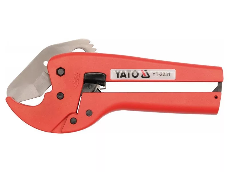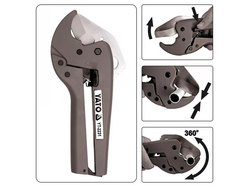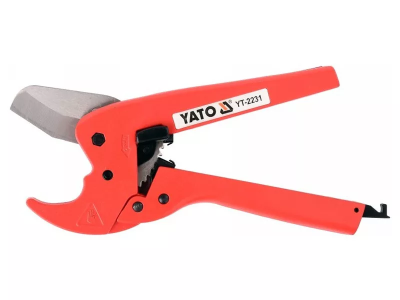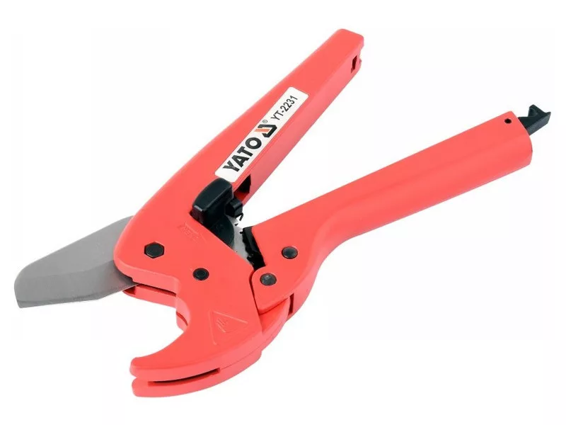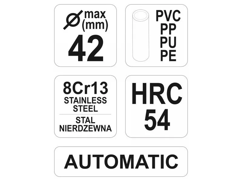 Professzionális olló racsnis mechanizmussal a 42 mm átmérőjű műanyag csövek hatékony vágásához.