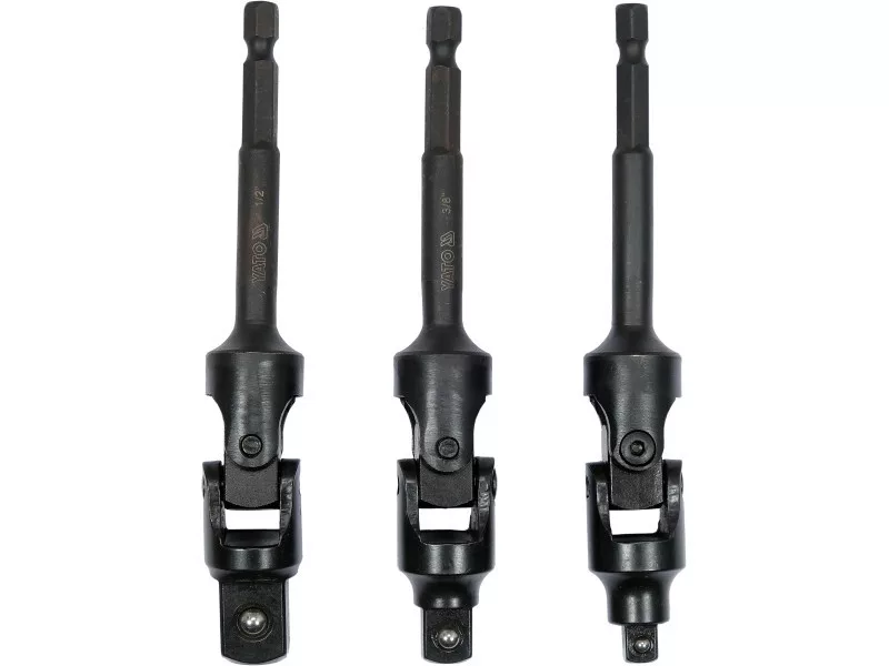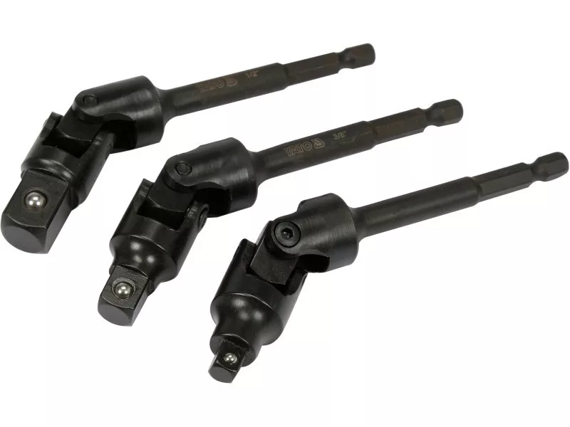 Adapterkészlet billenőkapcsolóval 3 db Adapterkészlet billenőkapcsolóval, amely lehetővé teszi a nehezen hozzáférhető helyeken lévő aljzatokkal való munkát. Hatszögletű(1/4'') végű gombbal hajtja meg.