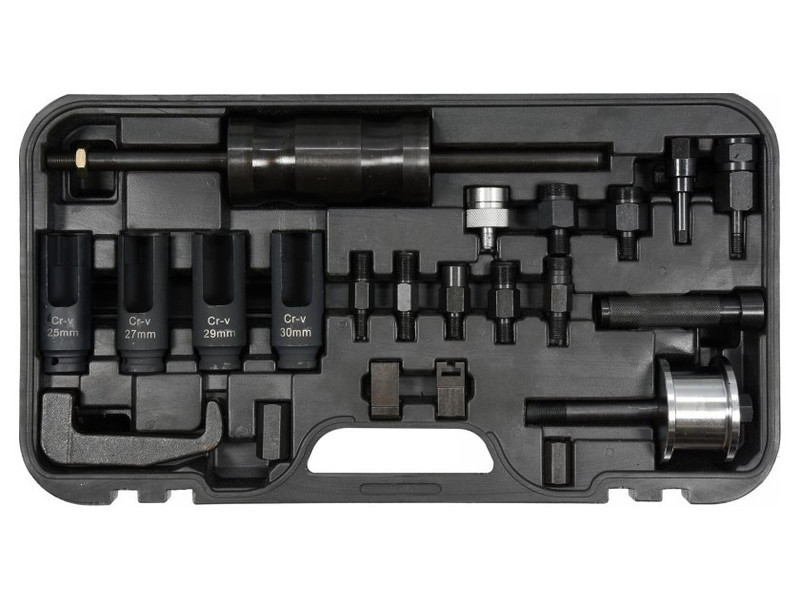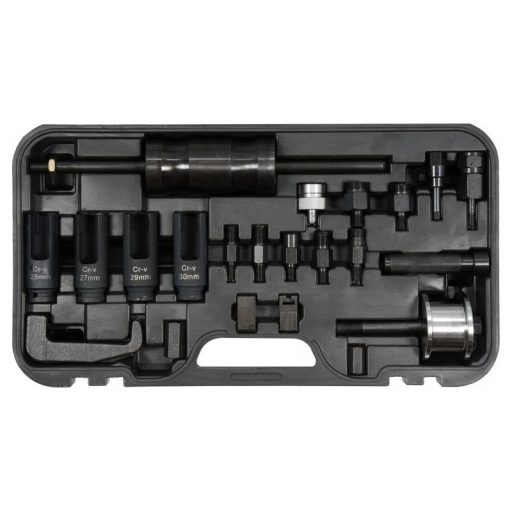 Professzionális tehetetlenségi kihúzó készlet injektorokhoz. A tok 22 alkatrészt tartalmaz a BOSCH, DELPHI, DENSO, SIEMENS injektorok eltávolításához.