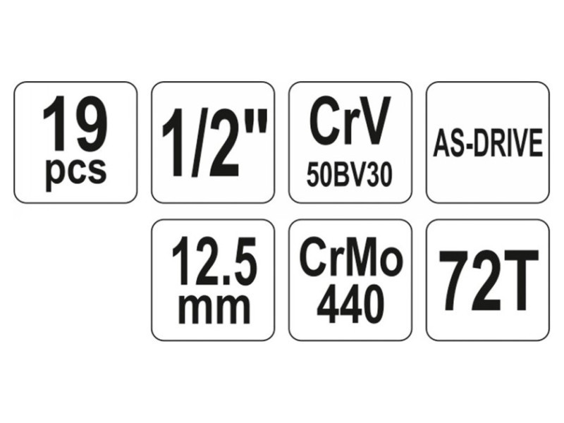 1/2"-os hatszögletű dugókulcsok készlete M8 és M32 közötti mérettartományban. A szerszámok kiváló minőségű CrV 50BV30 és CrMo440 acélból készülnek. Ez garantálja a kiváló termékminőséget és lehetővé teszi a hosszú élettartamot. A foglalatok AS-DRIVE technológiával készülnek.