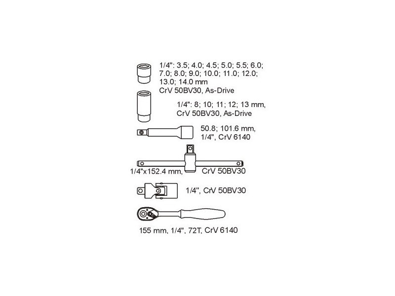 - 1/4" dugókulcsok: 3,5, 4, 4,5, 5, 5,5, 6, 7, 8, 9, 10, 11, 12, 13, 14 mm.