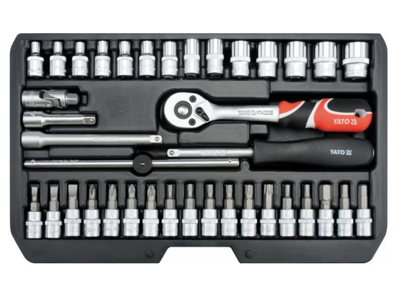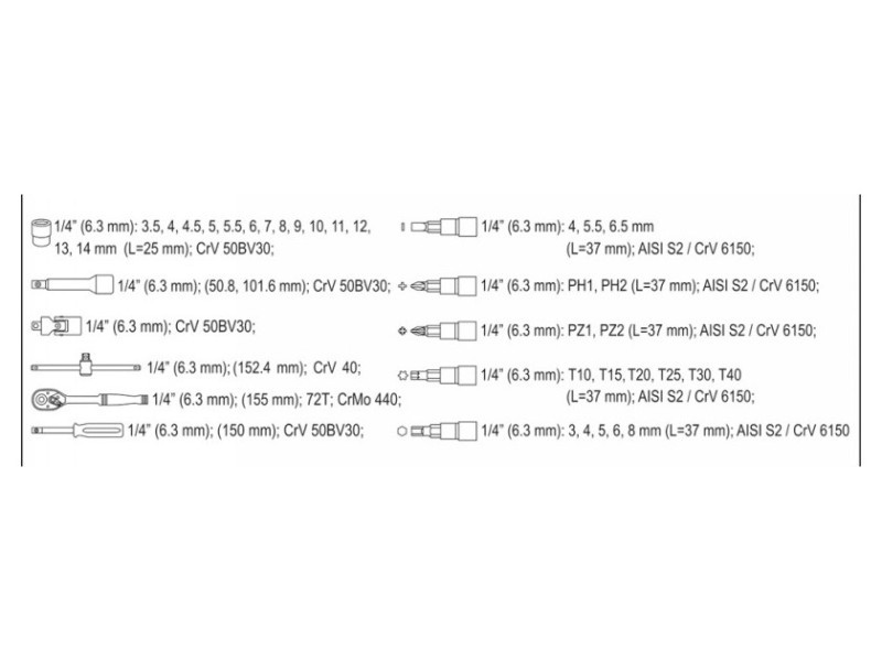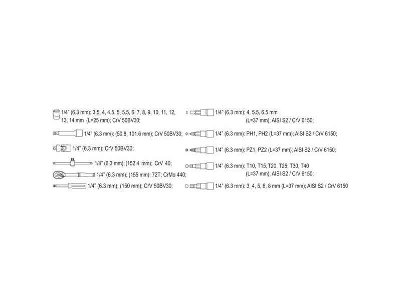 Professzionális dugókulcskulcs-készlet, amelyet a professzionális autóipari és gépészeti szolgáltatások igényeinek kielégítésére fejlesztettek ki. Az 1/4" méretű dugókulcsok és dugókulcshajtások robusztus szerszámacélból, króm-vanádium CrV 50BV30 króm-vanádiumból készülnek.