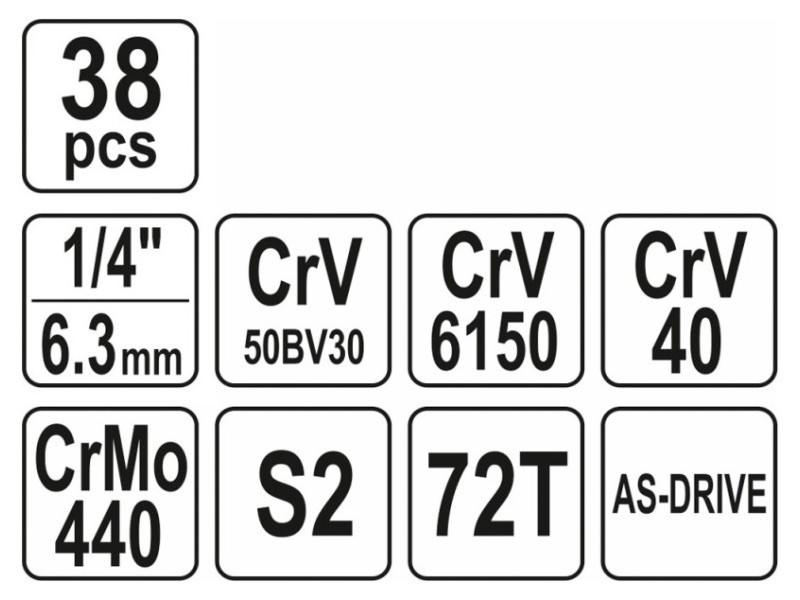 A CrV 6140 acélból készült racsni 72 foggal rendelkezik, és a legmagasabb technológiai szabványok szerint készült. A készlet kemény S2 acélból készült biteket is tartalmaz.