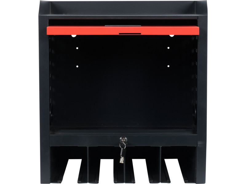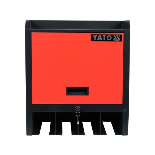 Zárható szekrény műhelyszerszámok tárolására. A szekrény felett egy felső polc, a szekrény alatt pedig egy 4 zsebbel ellátott polc található a szerszámok felakasztásához.
