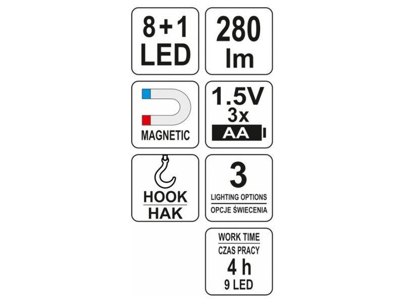 LED műhelylámpa, 8+1 LED-del. 280 lm fényteljesítményt produkál.