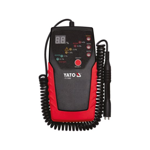 Az YT-72985 professzionális fékfolyadék-tesztelő DOT3, DOT4, DOT5.1 folyadékokkal használható, LCD kijelzővel és 6 LED-del rendelkezik. A fékfolyadék víztartalmának 3% feletti értékénél figyelmeztető jelzés aktiválódik. A 180 cm hosszú kábelen lévő rugalmas szonda kényelmes hozzáférést biztosít a fékfolyadék-tartályokhoz.