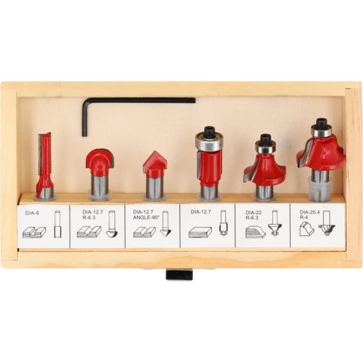 6 darabból álló marókészlet fa és néhány műanyag megmunkálásához 8 mm-es szárral ellátott marógépen. Az élvágók közül három csapágyazott végű a szerszám könnyű vezetése érdekében. Fa tokba csomagolva.
