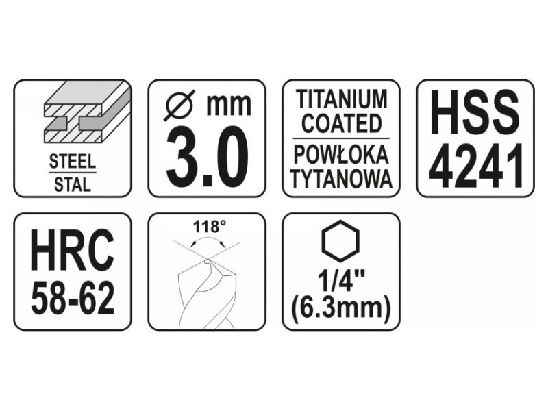 - egyetlen darab acélból készül, ami nagyon erős és tartós. A titán-nitriddel ellátott kemény 58-62 HRC bevonat ellenállóvá teszi a fúrószárakat a sérülésekkel és a tompulással szemben, megőrizve a fúrószárak geometriáját.