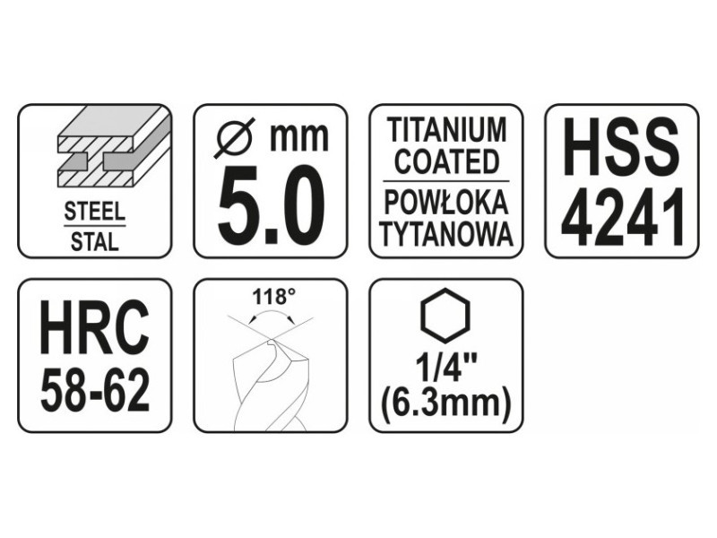 Egyetlen darab acélból készültek, így nagyon erősek és tartósak. 58-62 HRC kemény titán-nitrid bevonat fenntartja a sérülésekkel és a tompulással szembeni ellenállást, megőrizve a fúrószárak geometriáját.