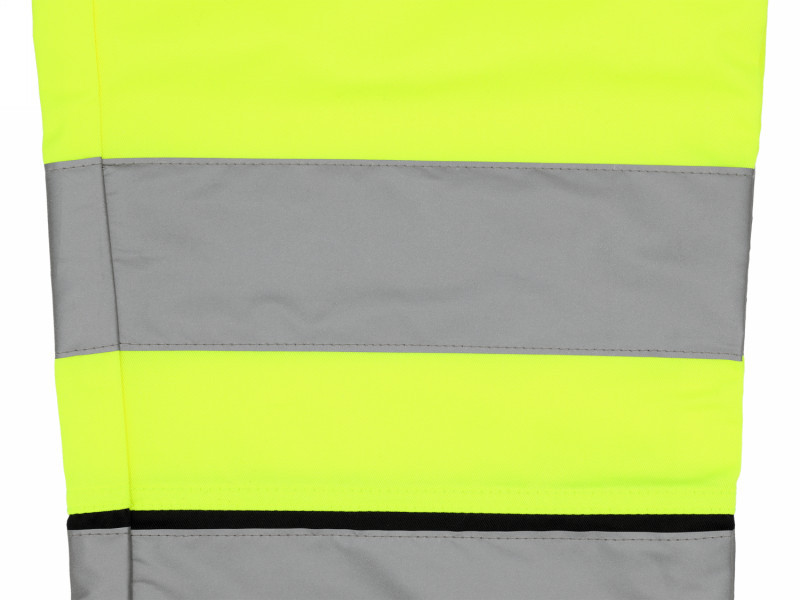 Az Oriolus sorozat egyszerű, technikai design-t ötvöz masszív kivitelezéssel és praktikus használati megoldásokkal. A széles, 70 mm-es fényvisszaverő sávok alkalmazása jelentősen javítja a sziluett láthatóságát korlátozott megvilágítású környezetben, éjszakai munkavégzésnél és kedvezőtlen időjárási körülmények között. Az ellentétes színkombináció és a térd alatti fekete anyag növeli a nadrágok tartósságát a szennyeződésnek és az intenzív használatnak kitett területeken.