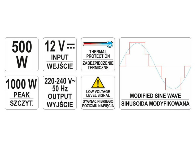 | Alkalmazás | 230 V-os váltakozó feszültséget igénylő elektromos készülékek akkumulátorról és 12 V-os egyenfeszültségű autóberendezésekről történő táplálására |