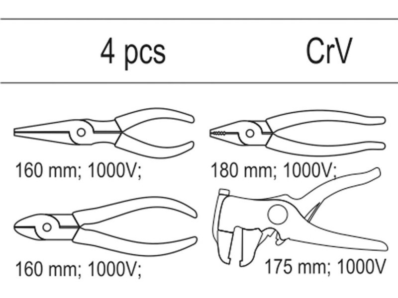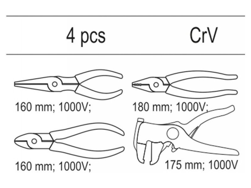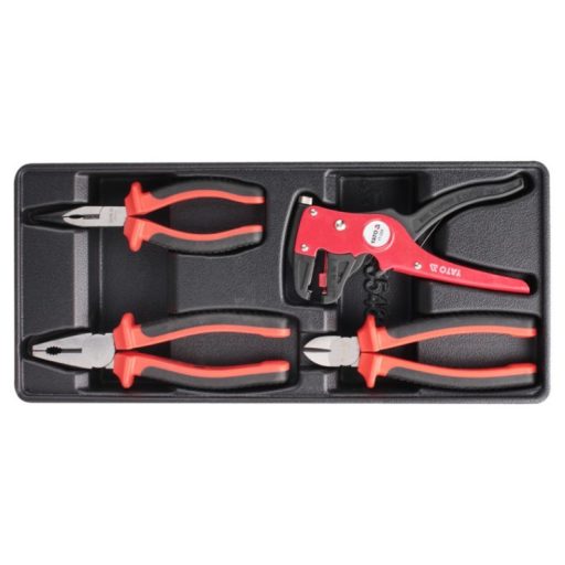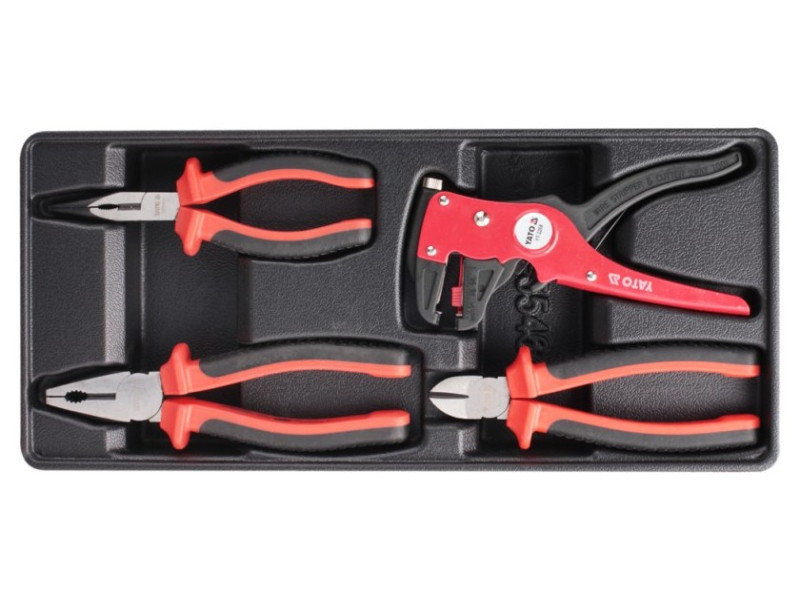 4 db szigetelőfogókészletet tartalmazó fiókbetét - betét - VDE hosszúkás egyenes fogó YT-2104 hossz 160 mm - VDE univerzális fogó YT-2102 hossz 180 mm - VDE átlós vágó YT-2109 hossz 160 mm - automata szigetelőcsiszoló YT-2268