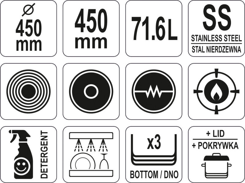 YATO GASTRO Fazék fedővel 71,6 liter 450 x 450 mm inox