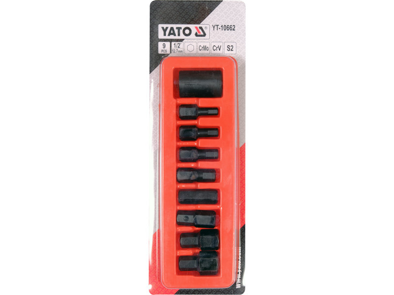 Speciális csavarok meglazítására tervezett 9 db 1/2"-os hatlapos ütvecsavarozó kulcskészlet. A csavarkulcsokat a gépiparban és az autóipari szervizekben használják pl. fejek, tengelycsapok, tengelyek, hajtásrendszerek vagy sebességváltók javítására. A különböző méretek biztosítják, hogy számos speciális munka elvégezhető legyen.