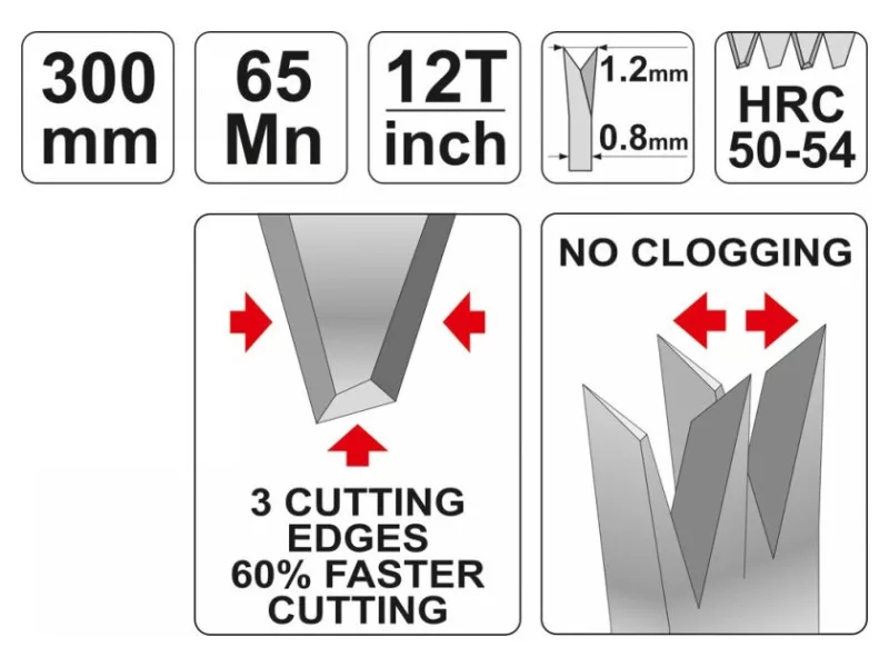 - speciális háromoldalú profillal ellátott fűrészfogak az agresszív vágáshoz mindkét irányban