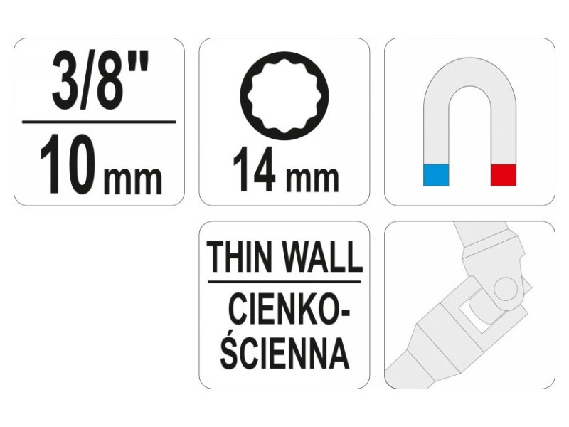 Gyújtógyertya dugaszolóaljzat billenőkapcsolóval. Hajtásméret 3/8", 14 mm-es foglalat.