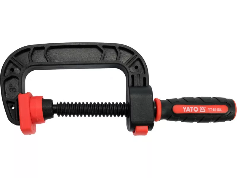 C típusú csavaros bilincs, méret 75 mm / 3" / nejlon műanyagból . Profilvastagság 15 mm. Gyorscsúszó rendszerrel van felszerelve. A maximális nyílás 75 mm. és a mélység kb. 70 mm. A nyomólemez egy forgócsapon helyezkedik el , megkönnyítve az anyaghoz való pontos alkalmazkodást. A nyomósíkok puha párnákkal vannak borítva, hogy megvédjék az anyagot a sérüléstől. A szorítócsavar kényelmes csúszásmentes fogantyúval van ellátva. Különböző anyagokból készült munkadarabok befogásához .