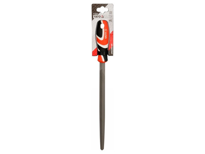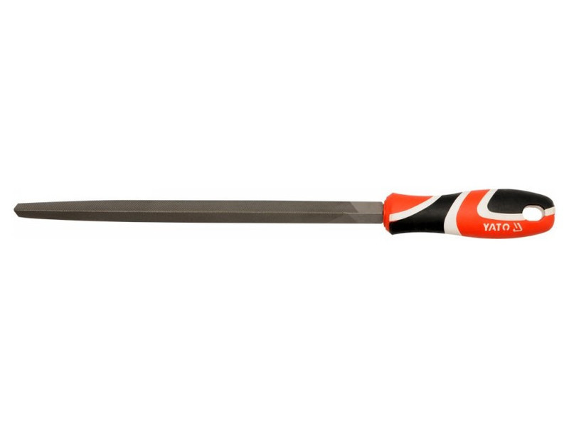 Háromszög alakú fémreszelő, hegyesített, kétoldalas vágású, 250 mm hosszú, három komponensű Yato fogantyúval.