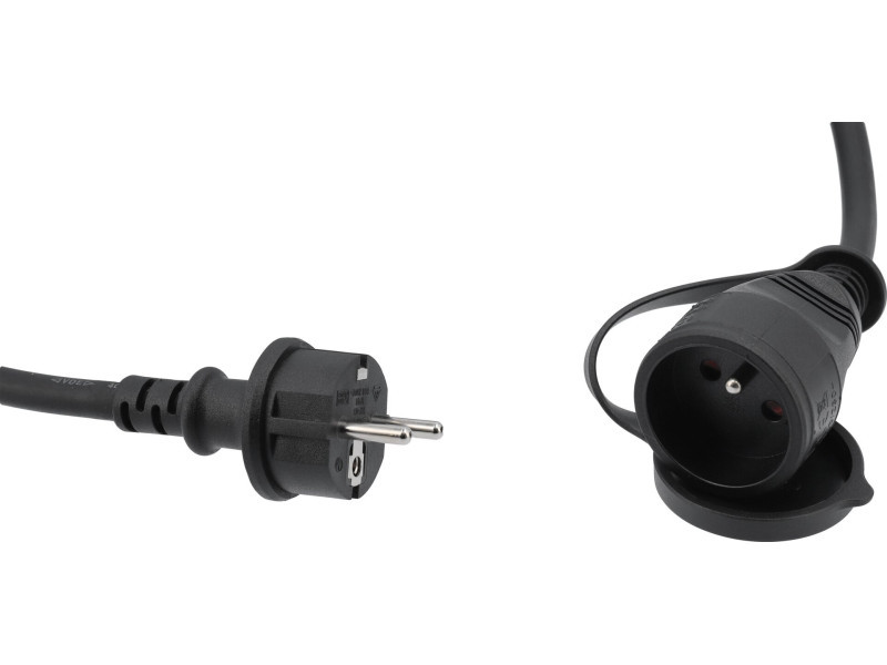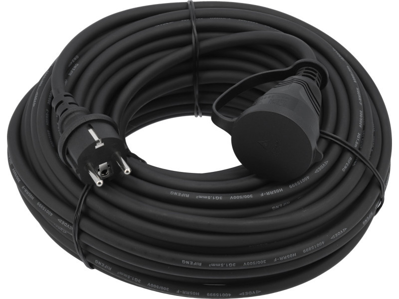 Épület hosszabbítókábel por- és fröccsenésbiztos aljzattal. A klórozott polietilén (CPE) köpenyű kábel mind beltéren, mind kültéren jól teljesít. Ellenáll az olajoknak, savaknak, a legtöbb oldószernek és a napfénynek. Hidegben nem merevedik meg. Nem terjeszti a tüzet. Az öregedéssel szembeni nagyfokú ellenállás jellemzi.