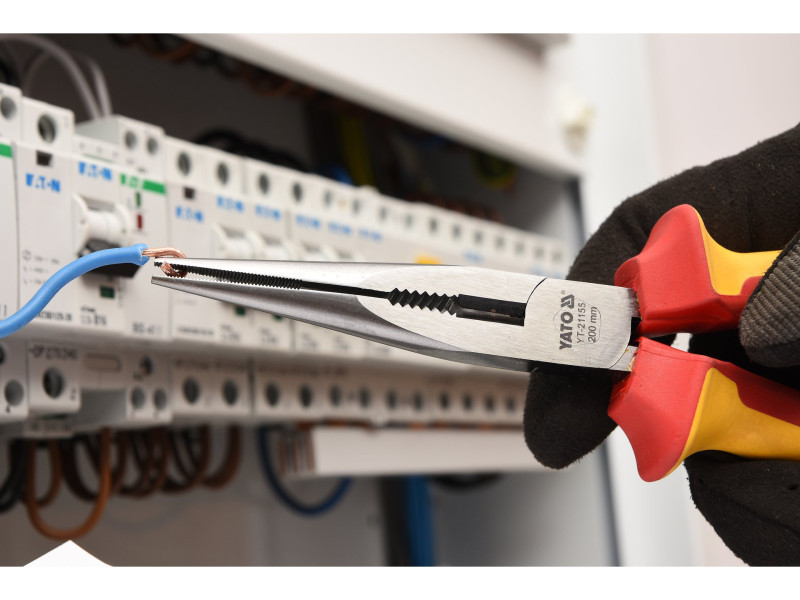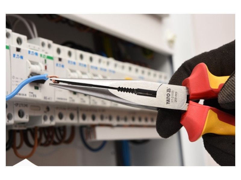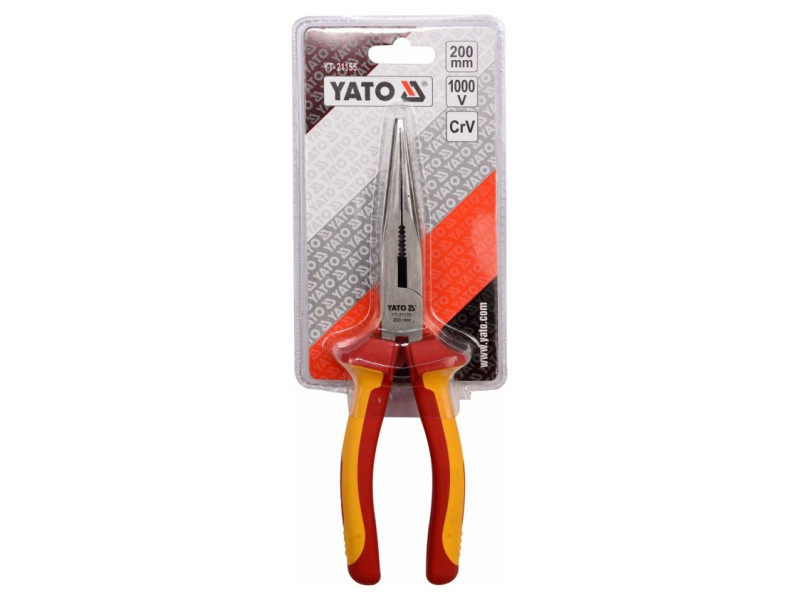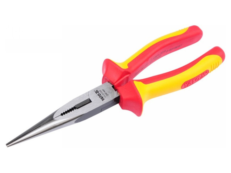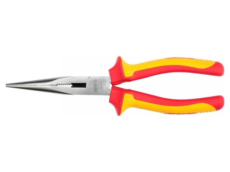 Y T-21155 hosszúkás egyenes fogó VDE szigeteléssel, kiváló minőségű CrV acélból. Félköríves és kúpos állkapocsprofil nagyon pontos hornyokkal és robusztus vágóelemmel.
