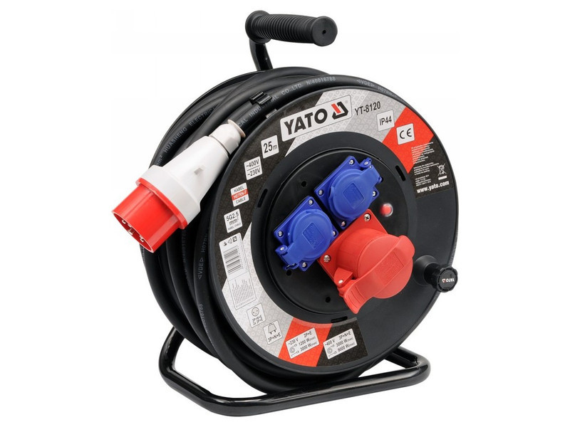 YT-8120 25 méter hosszú építőipari és műhelyhálózati hosszabbító kábel 2 aljzattal ~230V névleges feszültséghez gyermekvédelemmel és egy aljzattal ~400V névleges feszültséghez. A hálózati csatlakozó 5 pólusú dugó ~400V névleges feszültséghez. Hővédelemmel ellátott hosszabbító kábel. A robusztus műanyagból készült orsóra tekert neoprén gumiköpenyes kábel a hosszabbító kábelt beltéri és kültéri használatra teszi alkalmassá, pl. építkezéseken, kertben, gyárak előtt.