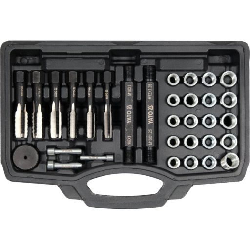 - 6 darab véső a sérült menetek javításához: M8 x 1,0, M10 x 1,0, M10 x 1,25, M12 x 1,0, M12 x 1,25, M14 x 1,25.