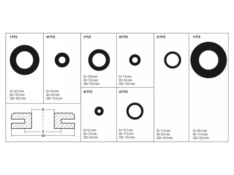 Állítsa be a tartalmatgumivezetők x180 (6,3x3x8 mm x40, 7,9x5x10 mm x40, 9,5x6x13 mm x40, 11x9x15 mm x25, 12,7x11x15 mm x20, 15,8x12x19 mm x5, 22x10 mm x5, 22x13 mm x40 25,4 x 17 x 32 mm x 5)