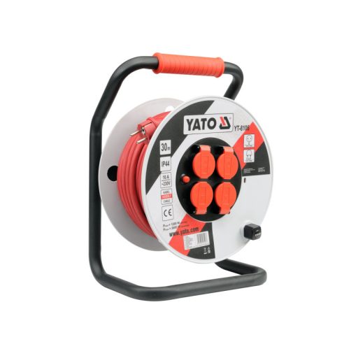 YT-8106 30 méter hosszú építőipari és műhelytekercses hosszabbító kábel 4 por- és fröccsenésbiztos aljzattal, hővédelemmel és gyermekvédelemmel. A tartós műanyagból készült dobra tekert, természetes gumiborítású kábel a hosszabbító kábelt beltéri és kültéri használatra teszi alkalmassá, pl. építkezéseken, kertben, gyárak előtt.