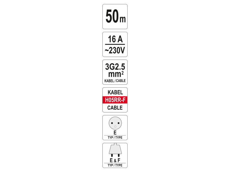 YT-8108 50 méter hosszú építőipari és műhelyhosszabbító kábelcsévél 4 por- és fröccsenésbiztos aljzattal, hővédelemmel és gyermekvédelemmel. A tartós műanyagból készült dobra tekert, természetes gumiborítású kábel a hosszabbító kábelt beltéri és kültéri használatra teszi alkalmassá, pl. építkezéseken, kertben, gyárak előtt.