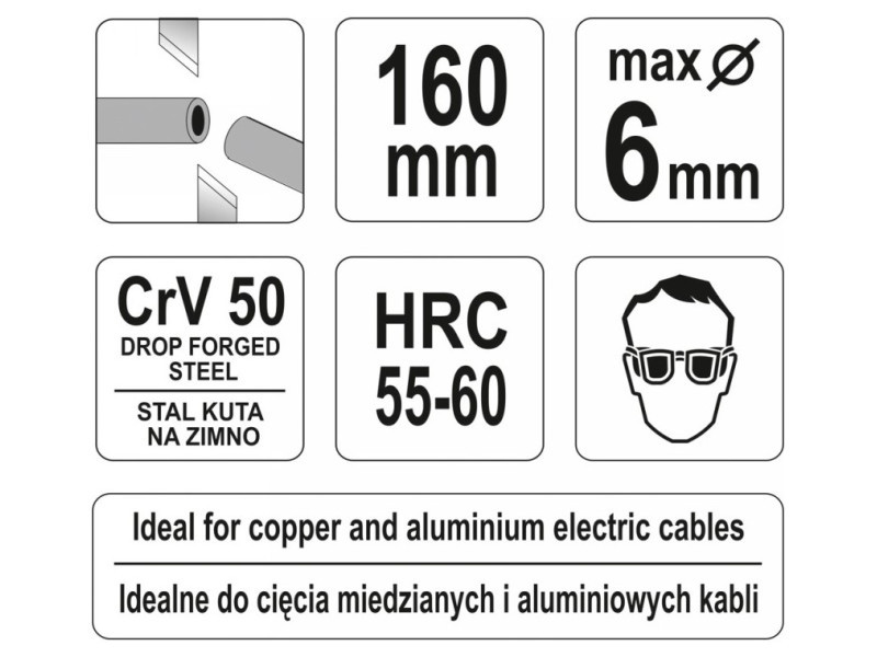 Fogó legfeljebb 6 mm átmérőjű kábelek vágásához. Ideális réz- és alumíniumkábelek vágásához.
