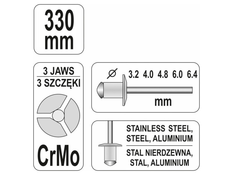 Kézi szegecselőgép acélszegecsekhez, rozsdamentes acélszegecsekhez és alumíniumszegecsekhez.