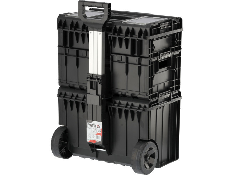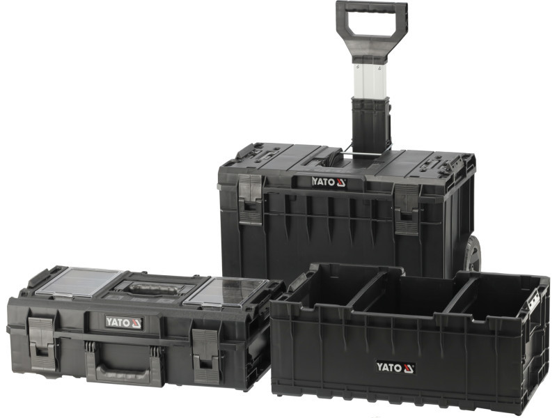 Az YT-09161 moduláris mobil ládakészlet lehetővé teszi a szerszámok kényelmes tárolását és könnyű szállítását. A készlet 3 alkatrészt tartalmaz, amelyek külön is kaphatók: kerekes alapláda YT-09166, konténer YT-09168, doboz YT-09169.